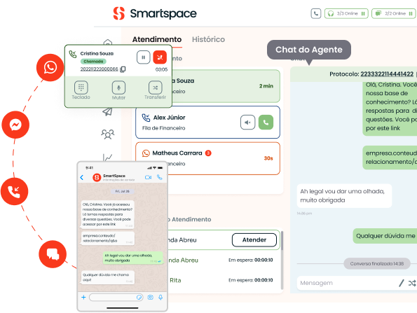 Com Smartspace, a comunicação flui entre equipes. O cliente inicia o contato com o atendimento e, se necessário, é transferido com contexto para o técnico ou vendedor — tudo no mesmo chat, sem perda de informação